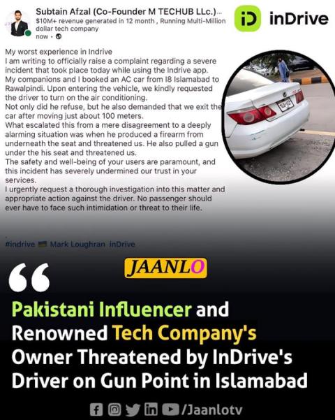 The Owner of a Famous Tech Company were Threatened at Gunpoint in Islamabad. - Bisma07 - 08-12-2023 A well-known Pakistani influencer (Subtain Afzal) and the owner of a famous tech company were threatened at gunpoint in Islamabad by a driver working for InDrive. The victim is requesting strong action against the person responsible. The photo shows the car belonging to the InDrive driver. Source: jaanlo |
