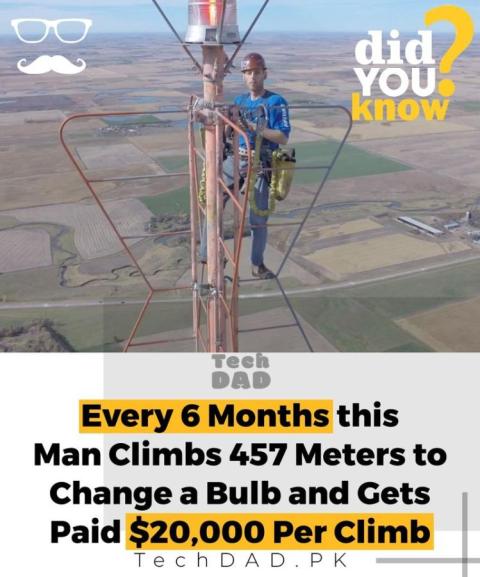 Every 6 Months This Man Climbs 457m to Change a bulb and Gets $20,000 Per Climb - Ayesha Shoukat - 08-13-2023 Imagine scaling a towering communication mast that reaches a staggering height of 1,500 feet. While most of us might hesitate to be suspended so high in the sky, for individuals like Kevin Schmidt, it's just another day on the job. Schmidt, employed by Sioux Falls Tower and Communications, regularly undertakes this daring feat to change a simple light bulb. Despite the inherent risks, Schmidt earns a substantial $20,000 (approximately Rs 16.5 lakh) for each climb, a testament to the extraordinary nature of his occupation. In a striking video clip, Schmidt fearlessly undertakes the task of changing a light bulb situated atop a television broadcast antenna, showcasing the remarkable and often overlooked world of tower climbing that some individuals tackle as part of their daily work routine. Source: TechDAD |