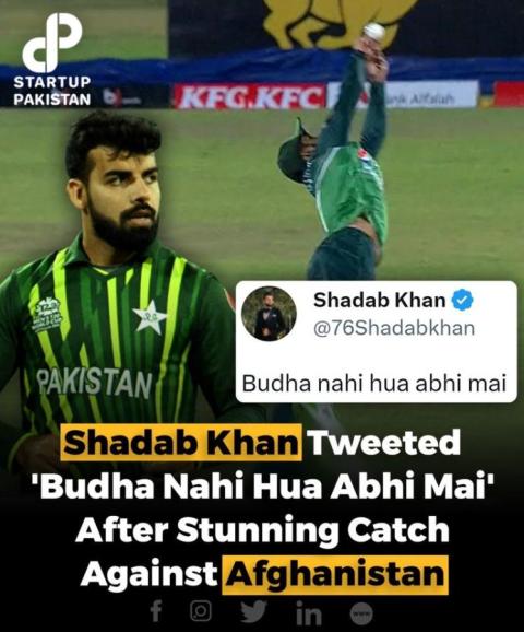 Cricketer Shadab Khan tweeted, "Budha nahi hua abhi mai" - RazaKhan1100 - 08-23-2023 Following his impressive catch against Afghanistan, cricketer Shadab Khan tweeted, "Budha nahi hua abhi mai," which translates to "I haven't grown old yet." Shadab's witty tweet humorously highlights his agility and youthfulness despite his remarkable performance on the field, showcasing his enthusiasm and skill in the game. Source: Startup Pakistan |