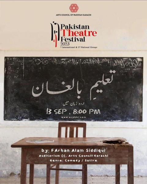 Pakistan Theatre Festival 2023, presented by Arts Council of Pakistan - Ayesha Shoukat - 08-28-2023 Pakistan Theatre Festival 2023, presented by Arts Council of Pakistan, Karachi will showcase Taleem-E-Balighan directed by Farhan Alam and written by Khawaja Moin Uddin. Taleem-E-Balighan - Comic/Satire A thought-provoking play directed by Farhan Alam Siddiqui, being performed at Pakistan Theatre Festival by ACPKHI. The play is a 1956 Pakistani social satire by Khawaja Moinuddin. The play humorously portrays adult education through satire. With its enduring relevance and comedic insights through time, "Taleem e Baligan" remains a cherished piece of Pakistani dramatic history, resonating with audiences even today. Director: Farhan Alam Siddiqui Writer: Khawaja Moin Uddin Cast: Owais, Farhan Rahim, Ajnesh Dodeja, Ali Raza, Shehriyar, Asim Language: Urdu Don't miss out PTF 2023, featuring a dynamic lineup of 7 international and 27 prominent national theatre groups. For an incredible span of 30 days, immerse yourself in the magic of 45 captivating shows, interactive workshops and talks. Explore a global cultural diversity and variety of genres under one roof. The festival will feature plays in various languages, including Urdu, English, Turkish, German, Sinhala, Persian, Punjabi & Sindhi. Date: 13 Sep Time: Gates Open 07:30 PM - Gates Close 07:45 PM Venue: Auditorium 1, ACPKHI Ticket Price: PKR 1000 (for Students: PKR 500) Get Your Tickets from Arts Council orĀ [To see links please register or login] Source: Ticket Wala PK |